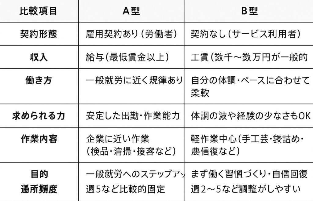 どちらも障害者総合支援法に基づく福祉サービスですが、働き方・契約・求められる能力・収入などが大きく異なります。